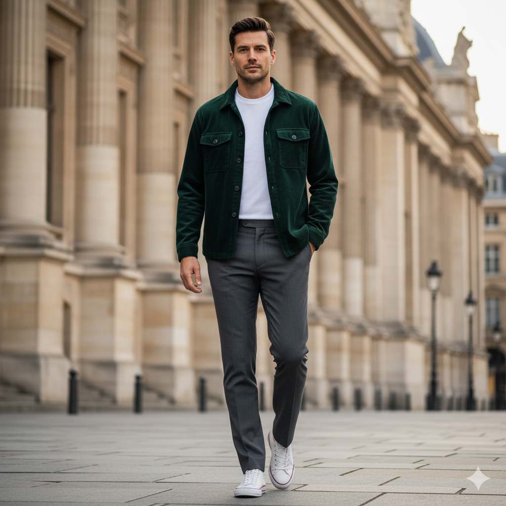 Layered over the tee is the Popular Corduroy Shacket, a versatile shirt-jacket hybrid that adds a rich texture and vibrant touch of color. Its sturdy corduroy construction and utility pockets make it an ideal outer layer for transitional weather.